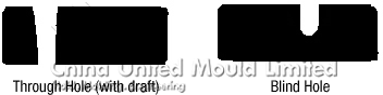 Holes can be added to a part for functionality or to reduce overall part weight (coring). Core pins are typically used to form a hole, preventing the molten plastic from filling in that space. Through holes go all the way through a part. Blind holes do not completely go through a part. Core pins for a blind hole are only supported by one end, so there is a greater degree of difficulty in forming them without defect. Forming holes can lead to defects or have a negative impact on aesthetics. Since the molten plastic flows around the core pin, it can leave a weld line (which may be visible and/or be weaker than the remainder of the part).